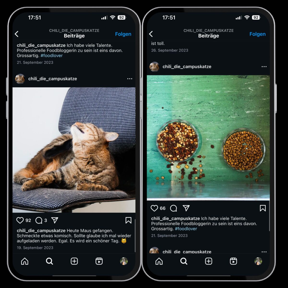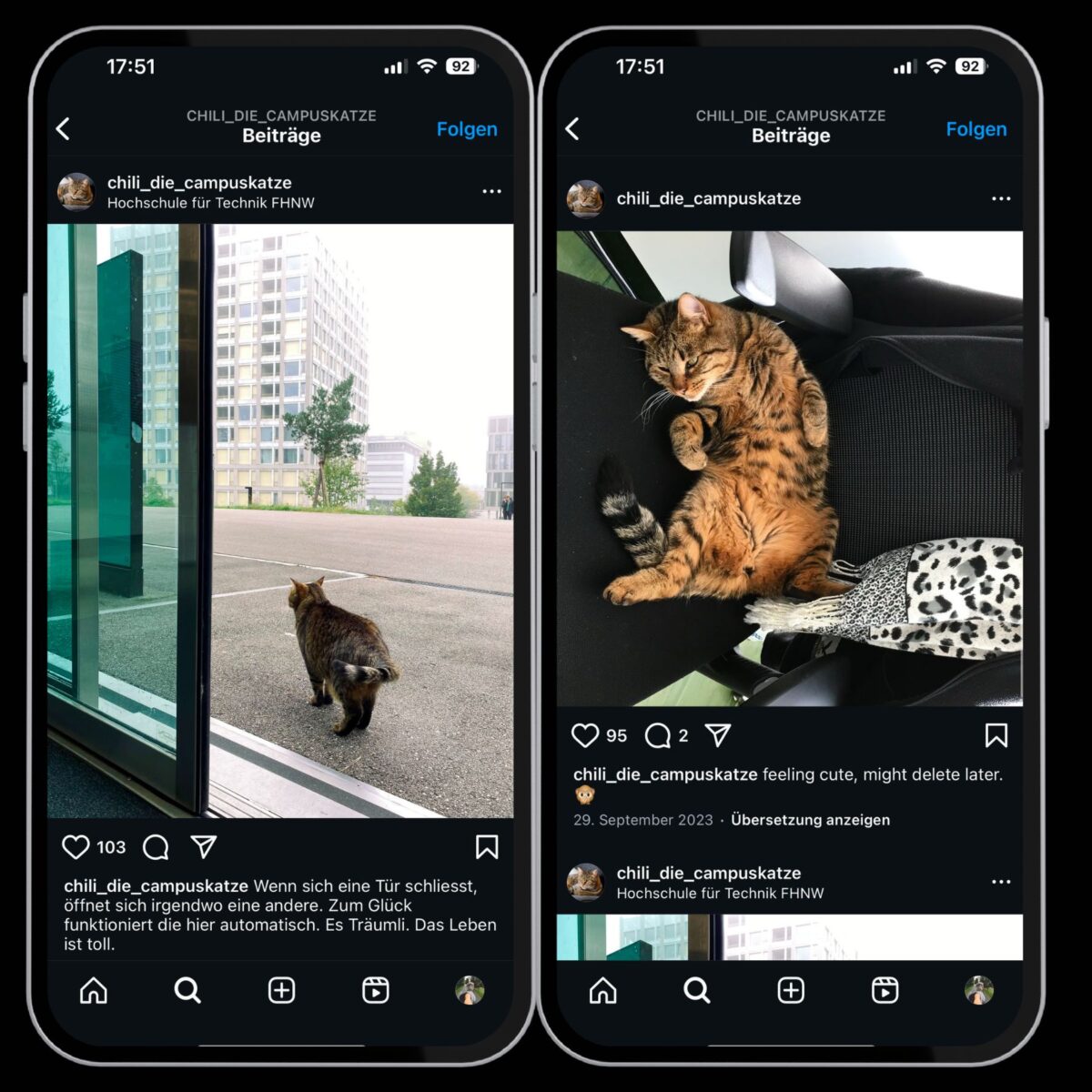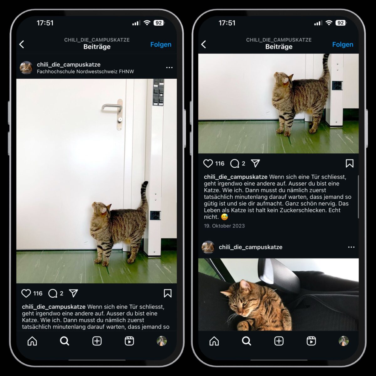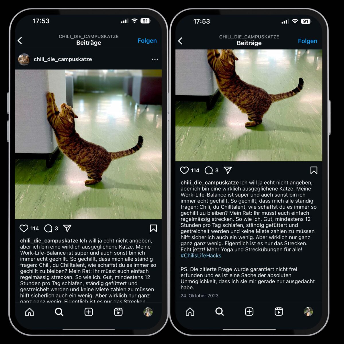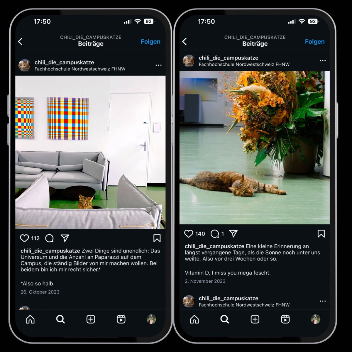 die idee: chili sollte nun einen eigenen instagram-kanal bekommen und dort aus ihrer einzigartigen, unterhaltsamen perspektive über ihr katzenleben auf dem campus berichten. sie wird genug mit der hochschule assoziiert, um mit ihr in verbindung gebracht zu werden – und hat gleichzeitig den vorteil, dass sie durch ihren inoffiziellen und offensichtlich fiktiven charaker (katzen können normalerweise weder schreiben, noch social media posts verfassen) möglichkeiten hat, die ein offizieller brand-accout niemals haben wird.