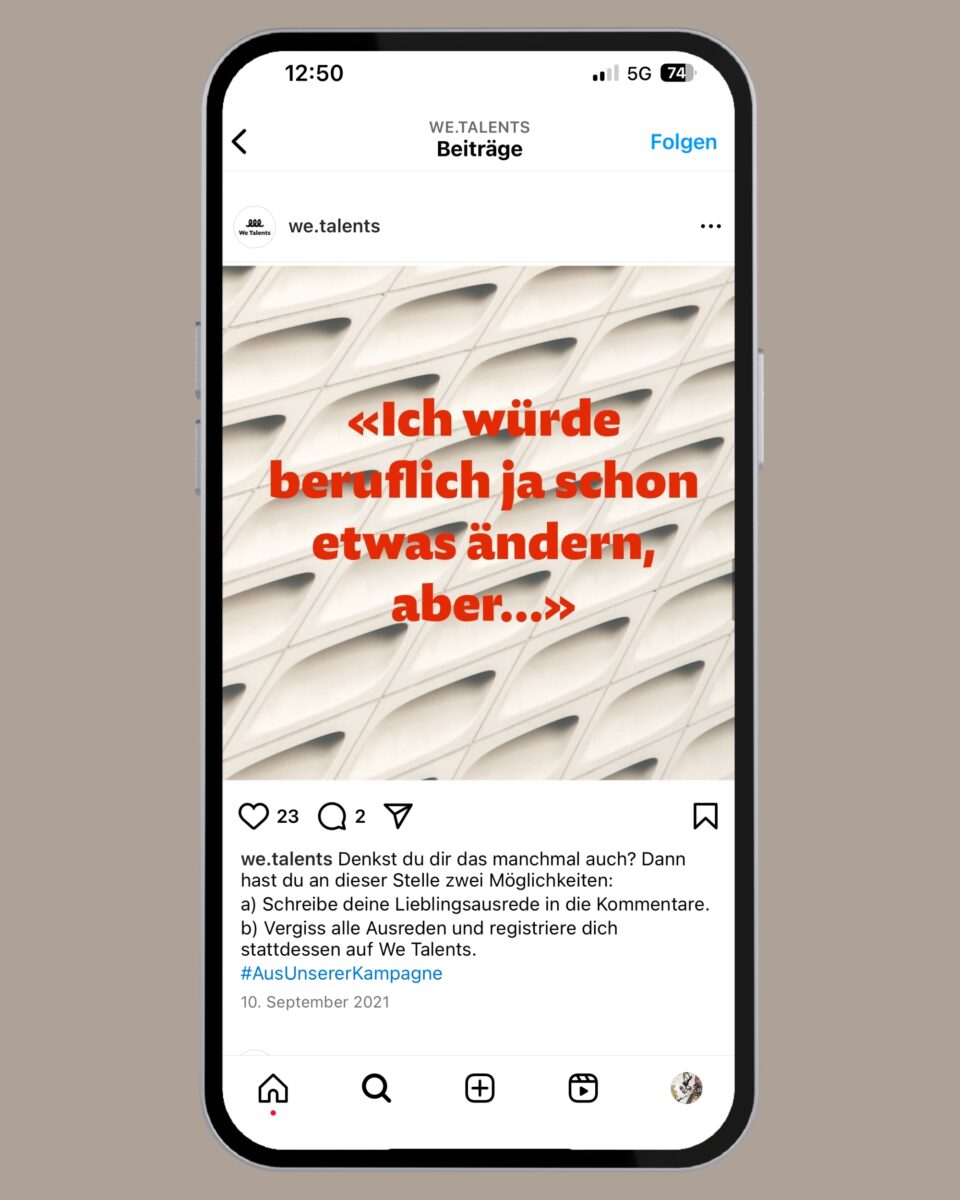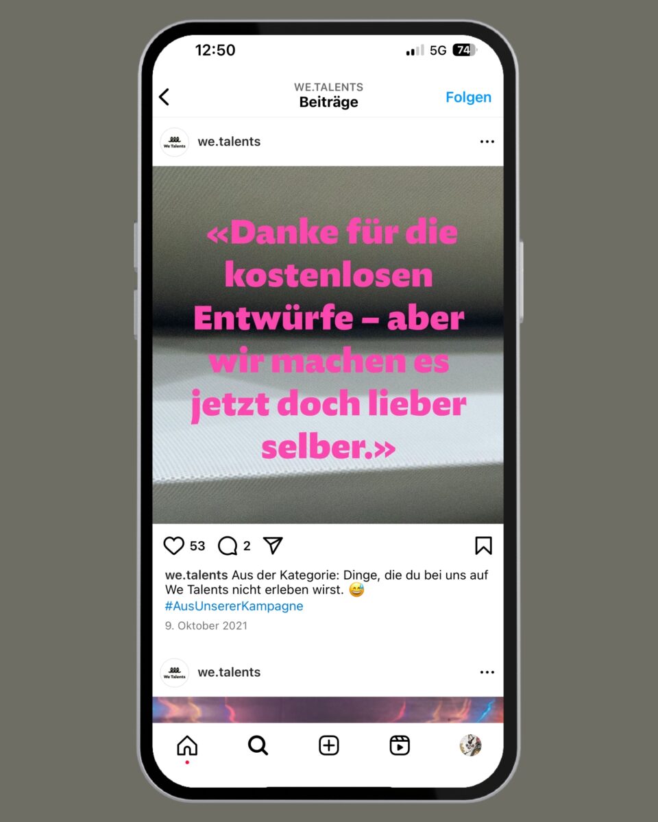 Eine crosschannel-Kampagne über diverse Plattformen hinweg. Dafür sammeln wir die nervigsten Sprüche, die den meisten Personen aus der Kreativbranche bekannt vorkommen sollten – und bieten We Talents als Lösung an: Wenn sie sich auf der We Talents Plattform registrieren, werden sie dese Probleme nämlich ganz bestimmt nie wieder haben.