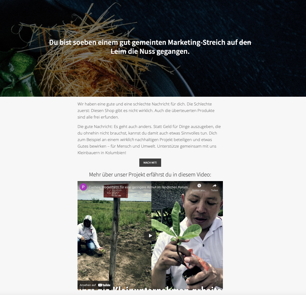 Sobald man aber auf ein Produkt klickte, wurde man auf eine Unterseite des Shops weitergeleitet, in der das Ganze aufgelöst wurde: Man wurde damit konfrontiert, dass der Shop nur ein Fake ist und man das Geld doch lieber in etwas tatsächlich Nützliches stecken sollte – nämlich das Pakka-Projekt.