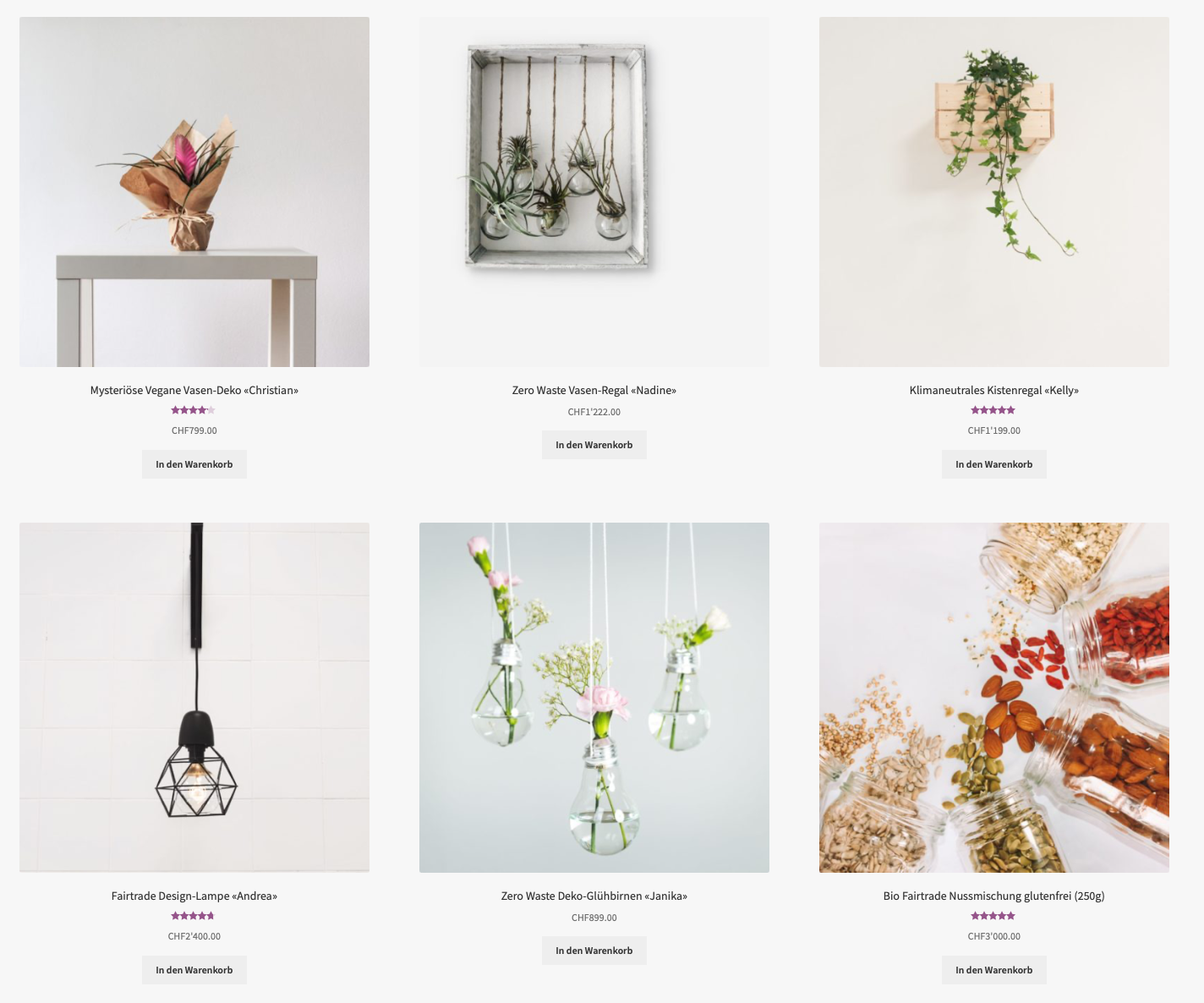 Die Kampagne beinhaltete nebst klassischen Anzeigen auch einen kreativen Kampagnenteil: den Fake-Webshop. Dafür gestaltete ich einen Online-Shop mit schönen und nachhaltigen, aber absurd überteuerten Produkten. Für die unwissenden Besuchenden sah er absolut echt aus – mit echten Produkten, echten Bewertungen und einer Markengeschichte.